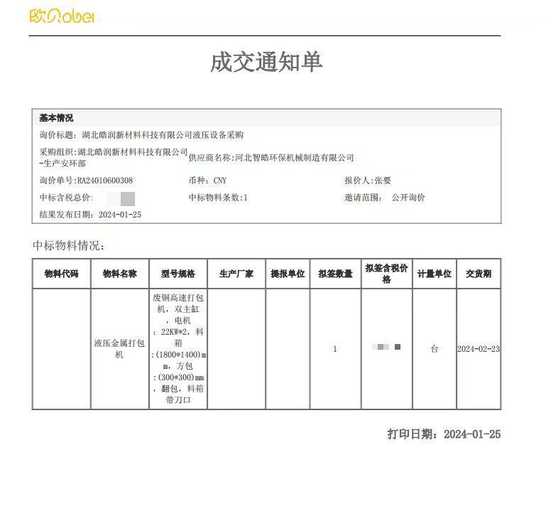 新年(nián)新氣象,中標新篇章!在這個辭舊(jiù)迎新的時刻,我(wǒ)們懷著激動的心情,向大家宣布,我們成功中標了湖北皓潤新材料科(kē)技(jì)有限公司液壓設備采(cǎi)購項目(mù)。這標誌著我們在市場競爭(zhēng)中取得了新的突破(pò),也為我們未來的(de)發展奠定(dìng)了堅實的基礎。我們將以更加(jiā)堅定的步伐,邁向(xiàng)更加輝(huī)煌的未來!